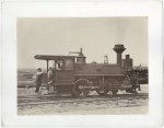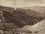 An image of the trestle erected just east of Promontory Summit, the place where the 1869 joining of the Union Pacific Railroad and the Central Pacific Railroad occurred, is shown in the above gallery. This trestle is celebrated in railroad lore because of its rickety appearance and its brief life as a mainline bridge. It was abandoned in favor of the adjacent and vastly superior “big fill”, just North of the trestle. The images have been improved to enhance their usefulness as sources for historical data. Examination of the leftmost image reveals the meaning of “rickety”. The number of the locomotive is seen in the center image. This locomotive is celebrated as the UPRR locomotive used in the ceremony that marked the completion of the Transcontinental Railroad. The image on the right illustrates the utility of images such as this to reveal details of daily life such as the attire of the men standing on the flatcar.